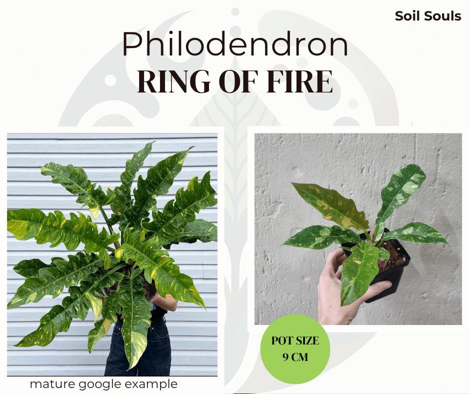The Philodendron 'Ring of Fire' is a rare, slow-growing tropical hybrid cherished for its unique, strikingly variegated leaves with deeply serrated edges. Its foliage displays a dynamic blend of colors, including shades of green, yellow, orange, red, and cream, which change and intensify as the leaves mature